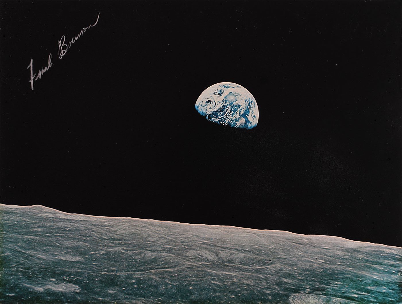 Fantastic color matte-finish 20.25 x 15.5 photo of the famous 'Earthrise' image taken during the Apollo 8 mission, signed in white grease pencil by Frank Borman. The photo is affixed to a same-size cardstock mount. In fine condition.