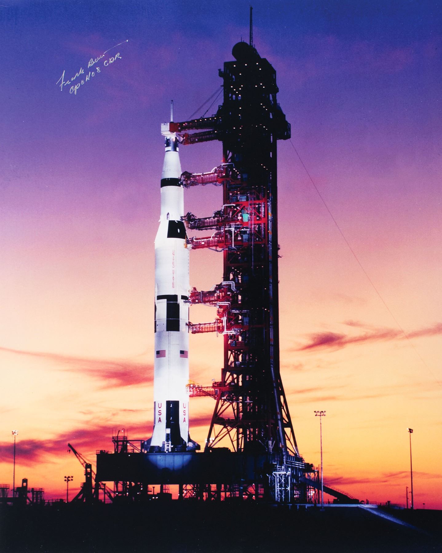 Vibrant color satin-finish 20 x 16 photo of the Saturn V rocket at dusk, signed in silver ink, "Frank Borman, Apollo 8 CDR." In fine condition. Accompanied by a certificate of authenticity from Novaspace.