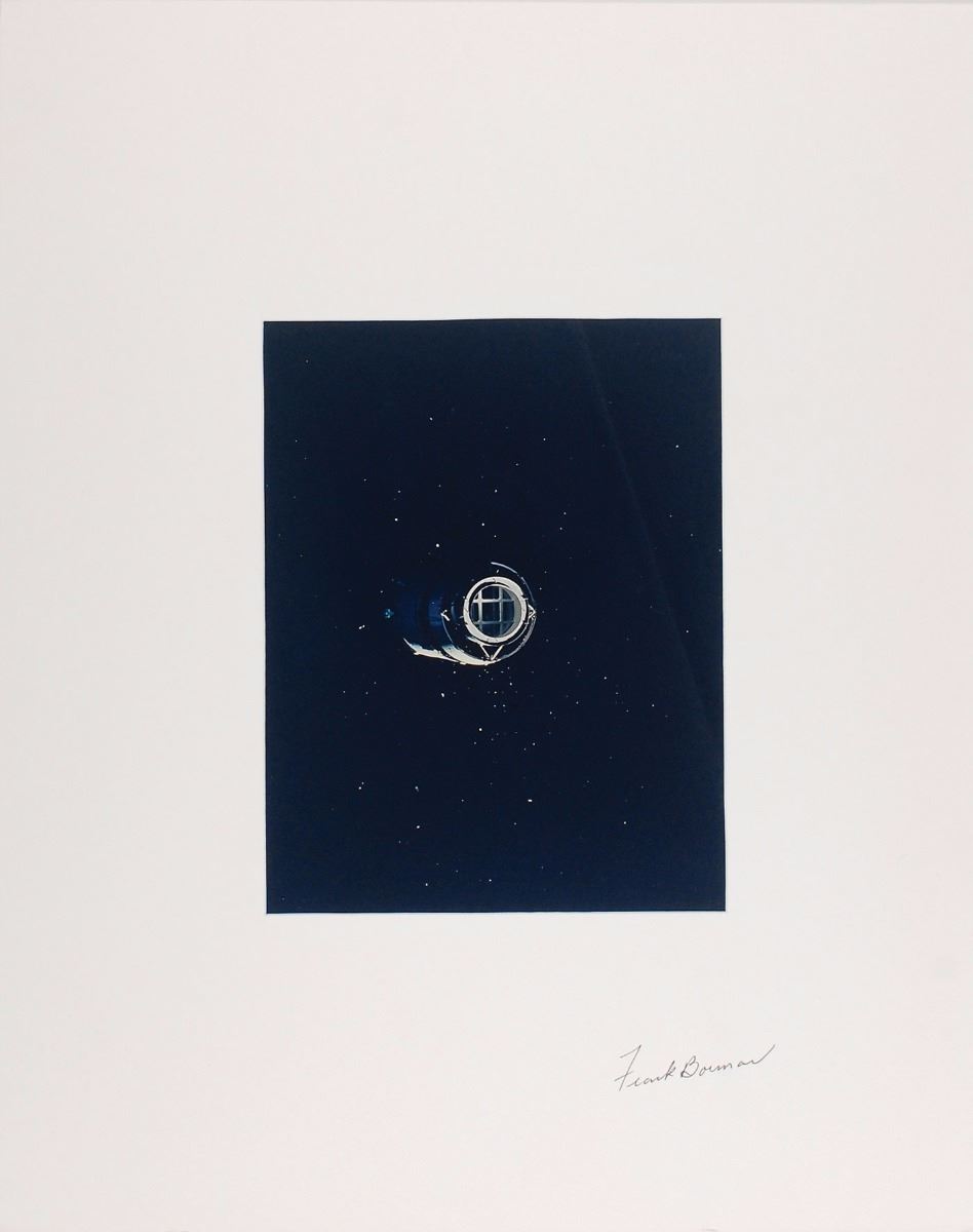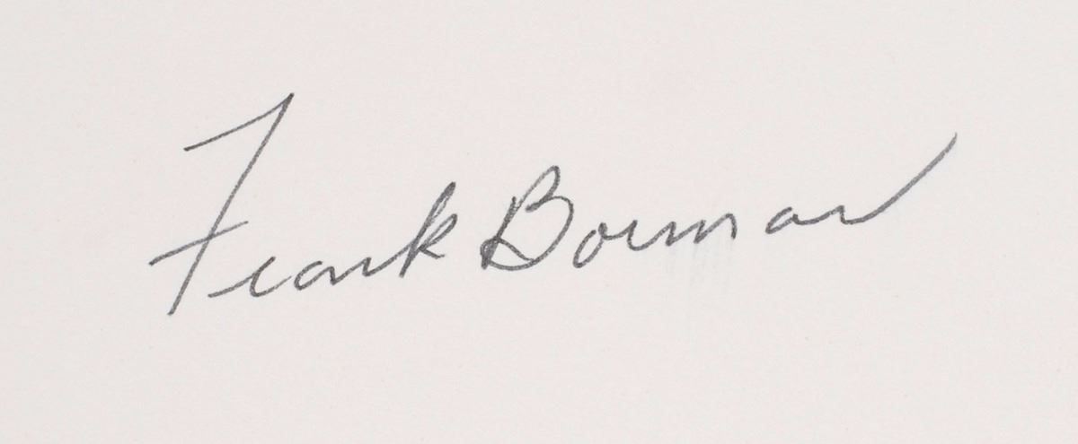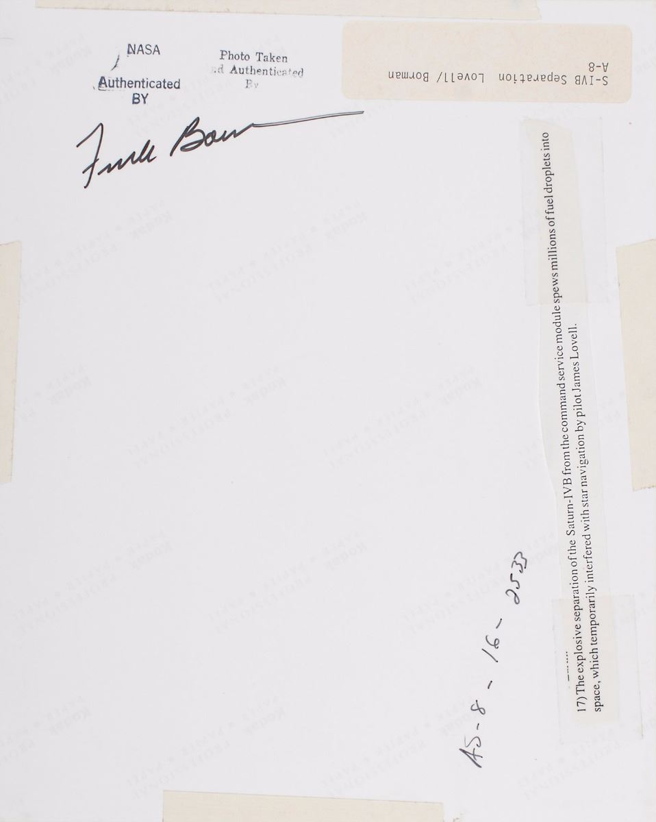 Color glossy 7.5 x 9.5 photo taken moments after the separation of the Saturn-IVB from the Apollo 8 command service module, matted to an overall size of 16 x 20, signed on the mat in black ink by Frank Borman. Reverse of photo bears a NASA authenticity stamp, “Photo taken and authenticated by,” and is signed underneath in black felt tip by Borman. In fine condition, with a diagonal bend to the photo and slight brushing to a single letter of the signature.