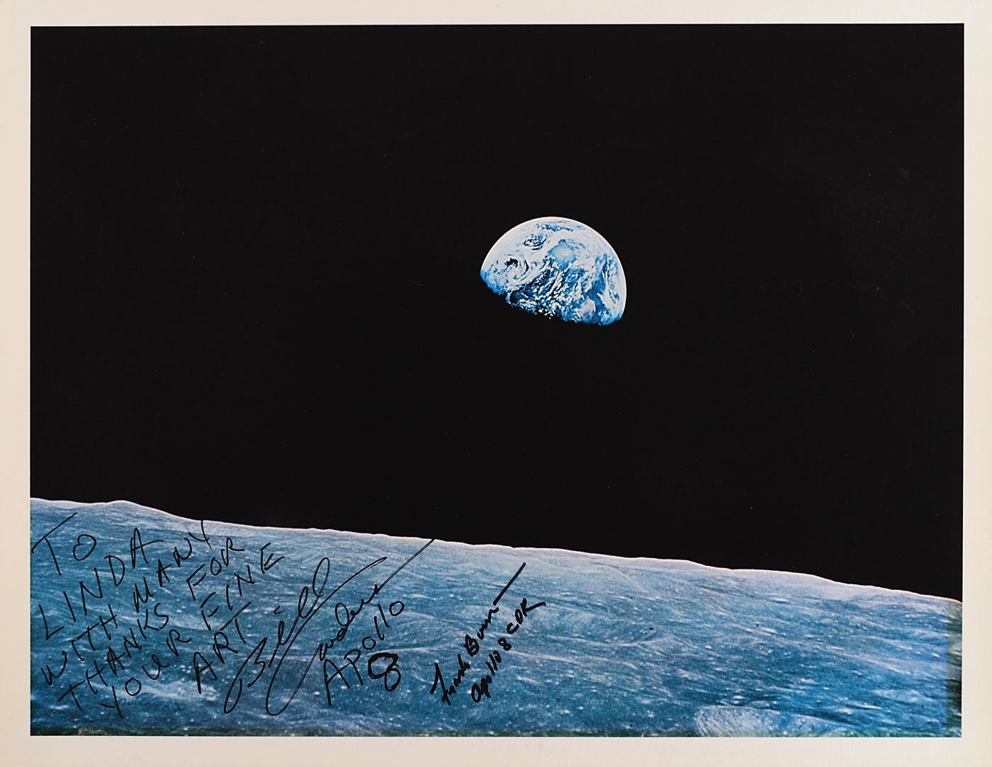 Iconic color 22 x 17 print of the Apollo 8 'Earthrise,' signed and inscribed in black felt tip, "To Linda, with many thanks for your fine art, Bill Anders, Apollo 8" and "Frank Borman, Apollo 8 CDR." In fine condition, with a few small creases and light bends.