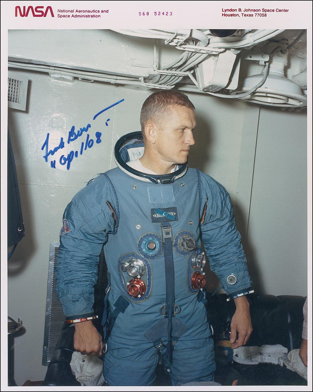 Color satin-finish 8 x 10 NASA ‘red-numbered’ photo of Borman in his spacesuit during water egress training, signed in blue felt tip. In very fine condition.