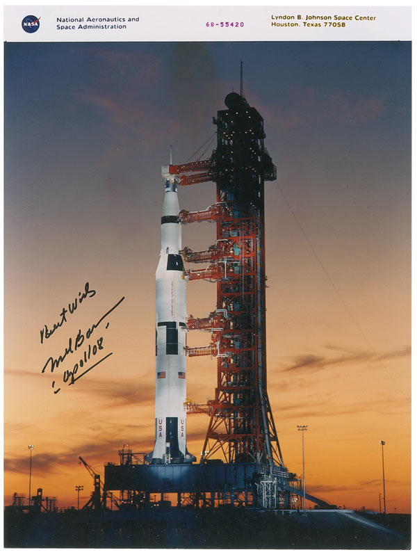 Color satin-finish 8 x 10.5 NASA photo of the Apollo 8 rocket on the launch pad, signed in black felt tip, “Best wishes, Frank Borman ‘Apollo 8.’” Some scattered light surface marks and impressions and a carefully removed inscription, otherwise fine condition.