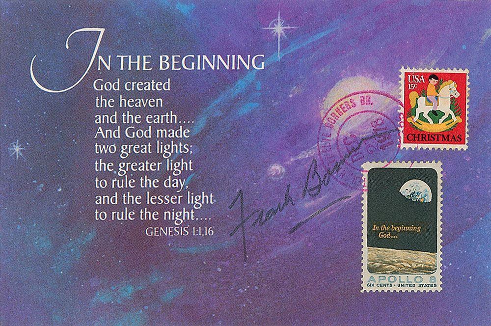 Printed biblical quote of Genesis 1:1,16, on a color 6 x 4 card, also bearing two postage stamps, one of Apollo 8, and a 1978 postal cancellation, signed in black felt tip by Borman. In fine condition.