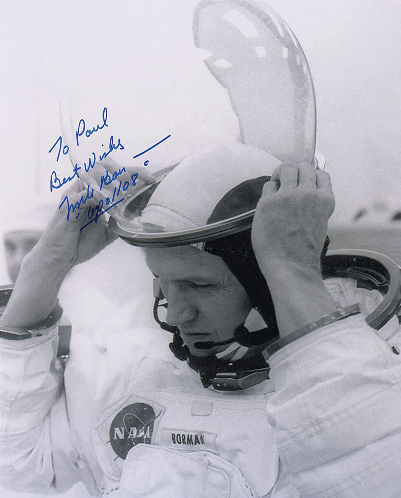 Satin-finish 8 x 10 photo, signed and inscribed in blue felt tip “To Paul, Best wishes, Frank Borman—’Apollo 8’.” In very fine condition.