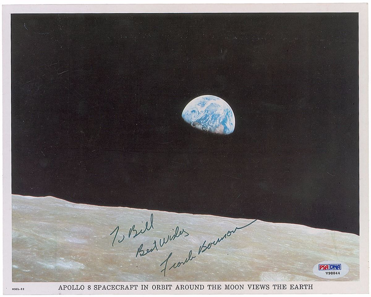 Official color 10 x 8 NASA lithograph of the famous ‘Earthrise,’ signed and inscribed in black felt tip, “To Bill, Best wishes, Frank Borman.” In fine condition, with trivial surface impressions and a PSA/DNA label affixed to lower right corner. Accompanied by a certificate of authenticity from PSA/DNA.