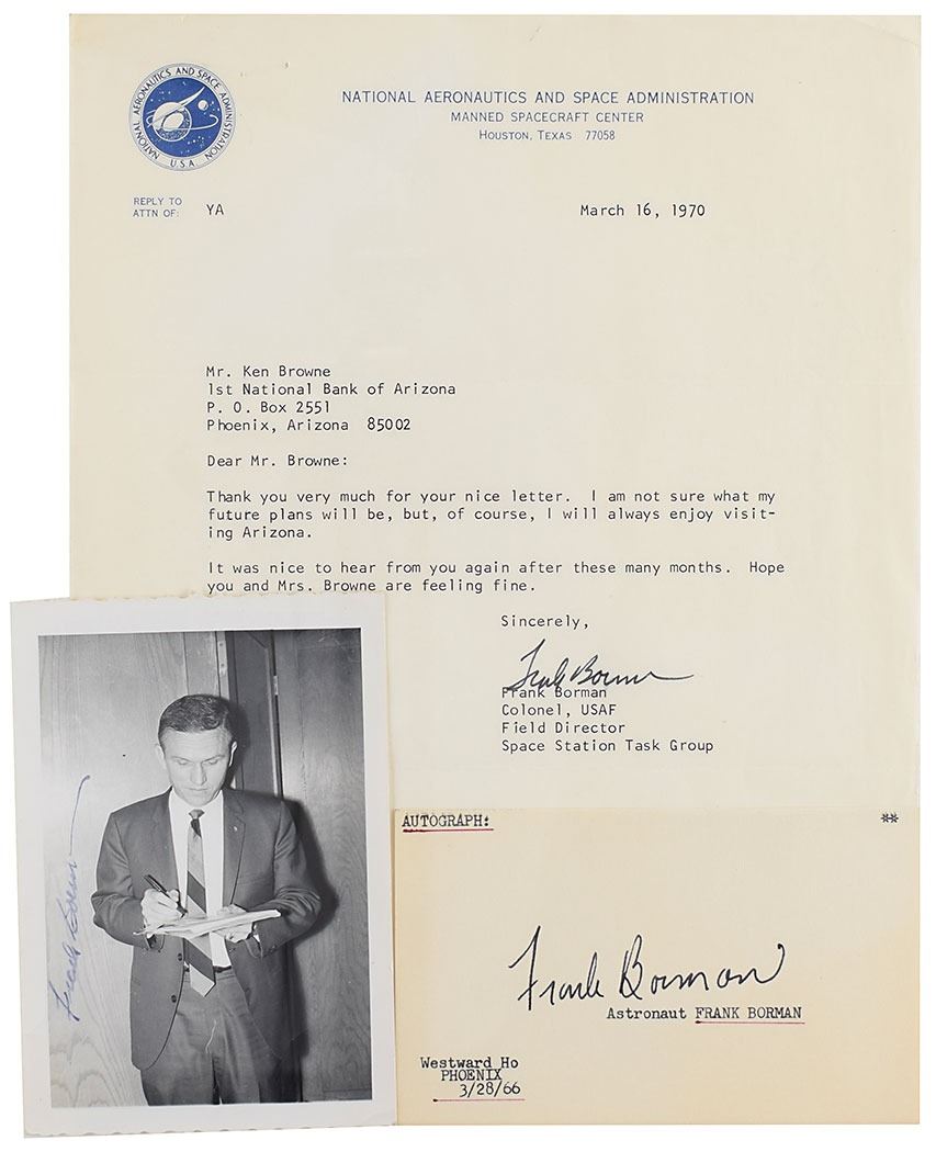 Three items: a vintage glossy 3.5 x 5 photo of Frank Borman signing his autograph, signed in fountain pen; an off-white 5 x 3 card signed in fountain pen by Borman; and a TLS, one page, 8 x 10.5, NASA letterhead, March 16, 1970, addressed to Ken Browne, in part: "I am not sure what my future plans will be, but, of course, I will always enjoy visiting Arizona." Typed collector's notations date the autographs to Phoenix in 1966 and 1969. In overall fine condition, with light surface impressions to the top of the photo from typed notations on the back. Accompanied by an original NASA mailing envelope.