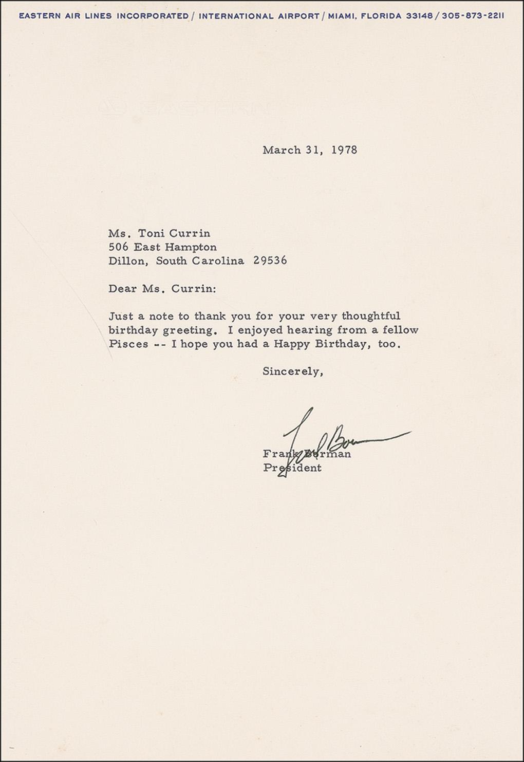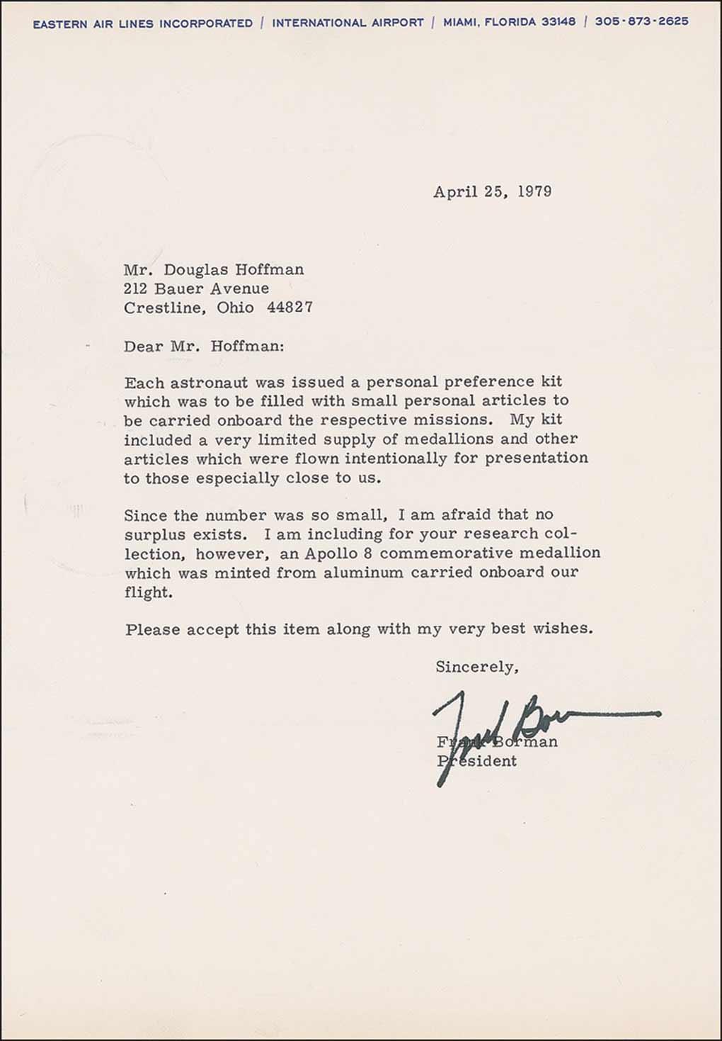 Two TLSs, both signed, “Frank Borman,” both 7.25 x 10.5, one page, and both on Eastern Airlines letterhead, dated March 21, 1978, and April 25, 1979. The second letter reads, in part: “Each astronaut was issued a personal preference kit…My kit included a very limited supply of medallions and other articles which were flown intentionally for presentation to those especially close to us. Since the number was so small, I am afraid that no surplus exists.” Letter is also accompanied by the original mailing envelope. In fine condition.