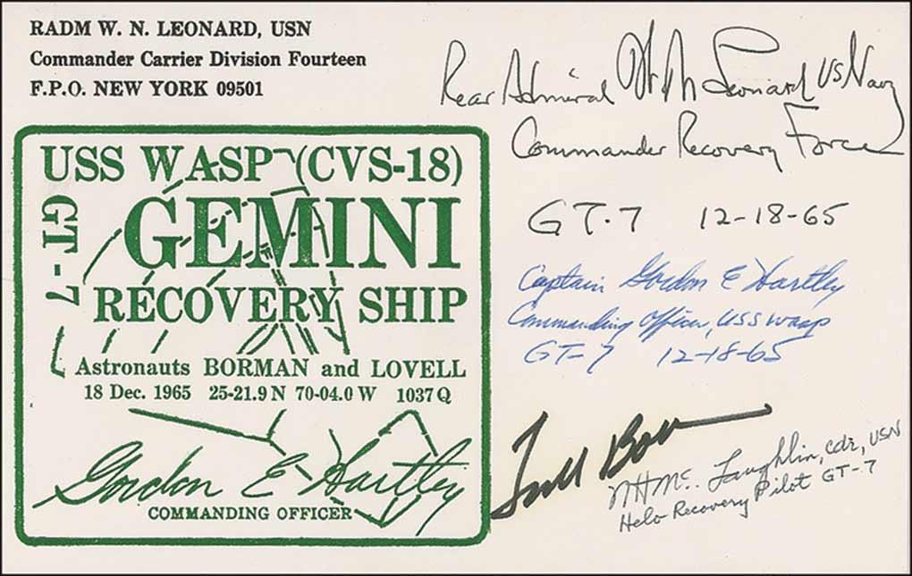 Gemini 7 recovery ship postal cover, 7 x 4.25, with a cachet honoring the USS Wasp, signed in black felt tip by Borman, and also signed by three recovery officials. In fine condition, with some light haloing to Borman’s signature.