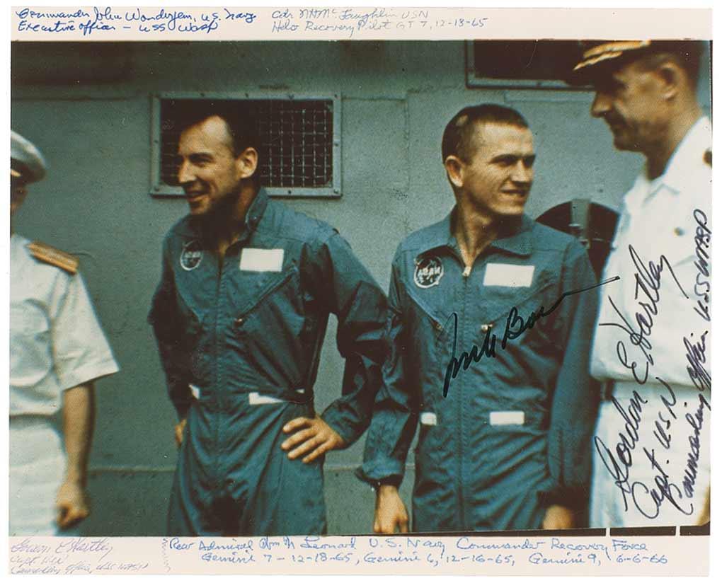 Color glossy 10 x 8 reprinted photo of the Gemini 7 recovery, signed in black felt tip by Frank Borman, also signed by four members of the recovery personnel including Gordon E. Hartley, commander of the USS Wasp (with an additional in the photo signature of Hartley). In fine condition, with slightly grainy image quality.