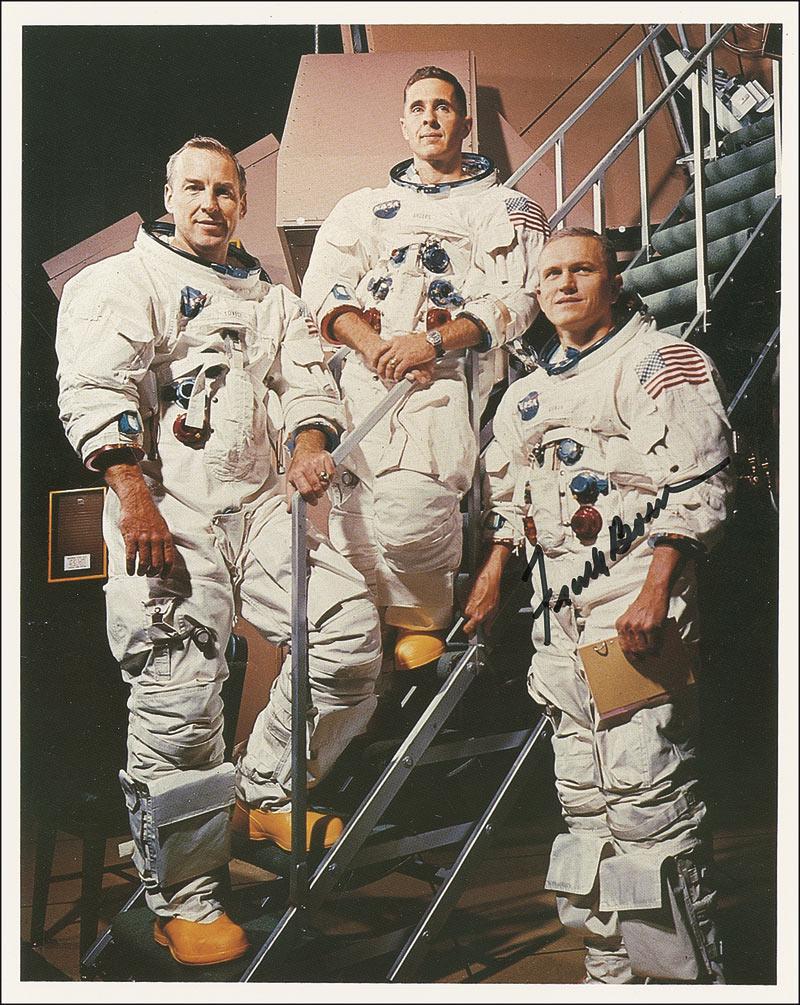 Color 8 x 10 NASA photo of the Apollo 8 prime crew posing in their space suits, signed in black felt tip by Borman. In very fine condition. Pre-certified Scott Cornish and RRAuction COA.