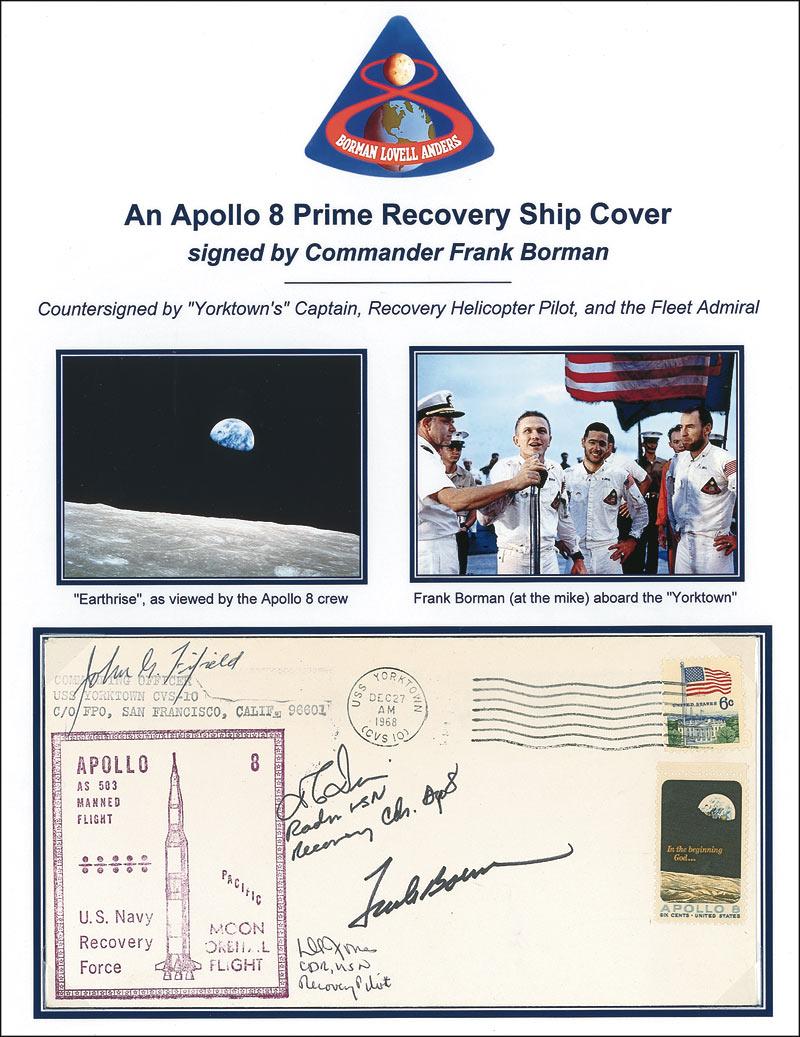 Apollo 8 prime recovery ship commemorative cover with a stamped cachet honoring the Apollo 8 U. S. Navy recovery force, signed in black felt tip, and also signed by three members of the recovery crew. Removably presented on a color 8.5 x 11 informational sheet. In fine condition.