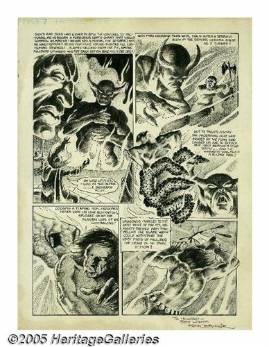 <B>Frank Brunner - Phase #1 "Sword of Dragonus" page 7 Original Art (Quartuccio, 1971).</B></I> Frank Brunner used a delicate graytone technique to capture this demonic battle in the sword and sorcery thriller, "The Sword of Dragonus." Brunner's talent for fantasy art would later serve him well on such celebrated characters as Conan, Dr. Strange, and Howard the Duck. The image area of this page is 13" x 18", and the art is in Excellent condition. The art was inscribed and signed at the lower right by Frank Brunner. This pulse-pounding page is sure to be a treasured showpiece for any fan of the Brunner mystique!