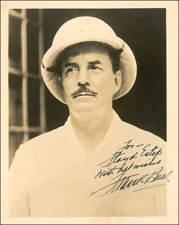 Vintage glossy 8 x 10 photo of a pensive Buck in his safari gear, signed and inscribed in fountain pen, “For—Floyd Estep, with best wishes, Frank Buck.” Light corner creasing and surface dings, some faint surface rubbing and a spot of soiling on the bottom border, otherwise fine condition.