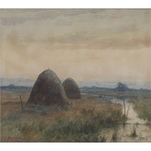 Frank C.Peyraud,(American, b.1858), Haystacks, c.1891;watercolor, 11in. x 11.75in., signed and dated.Important Chicago area landscape painter.He studied at the Art Institute of Chicago and in Paris.He exhibited from the 1890s-1920s, at the Chicago Society