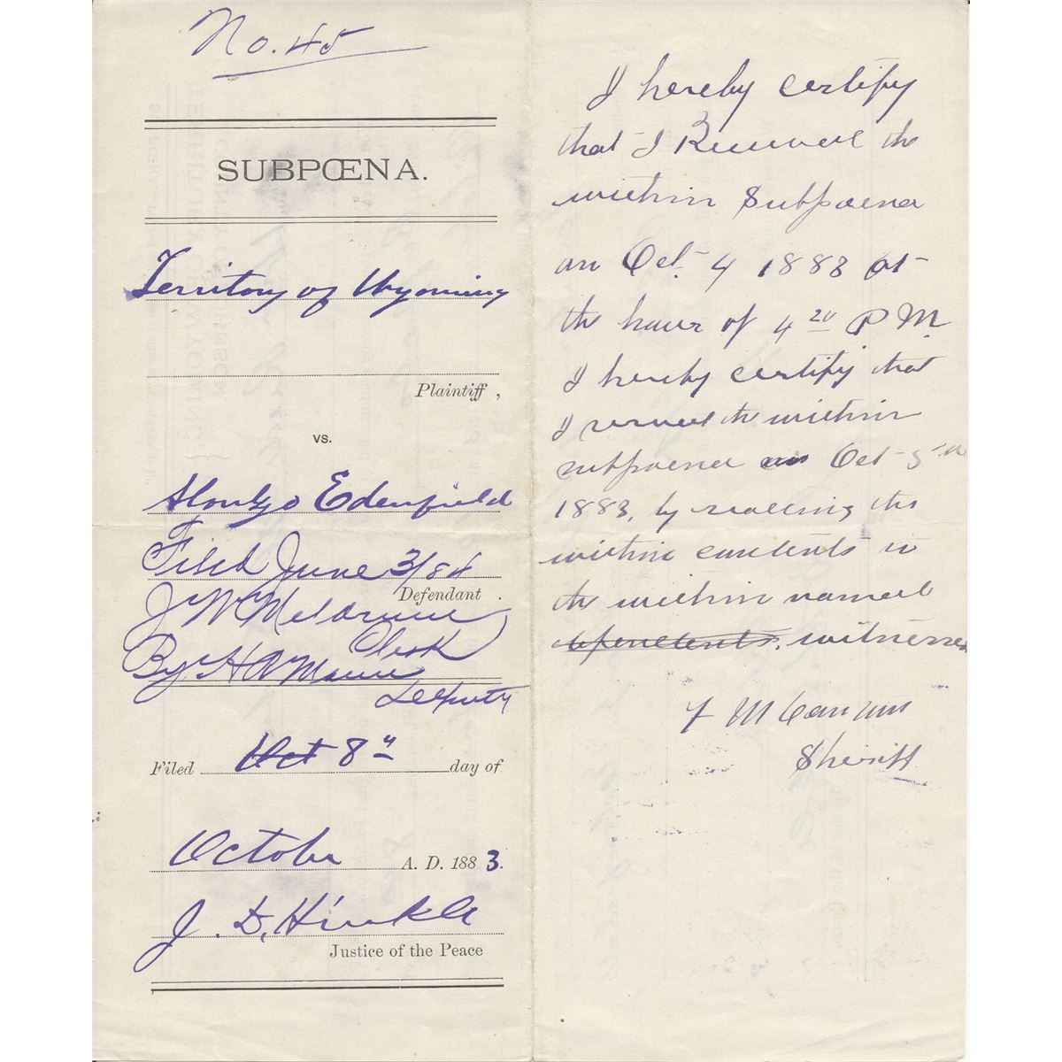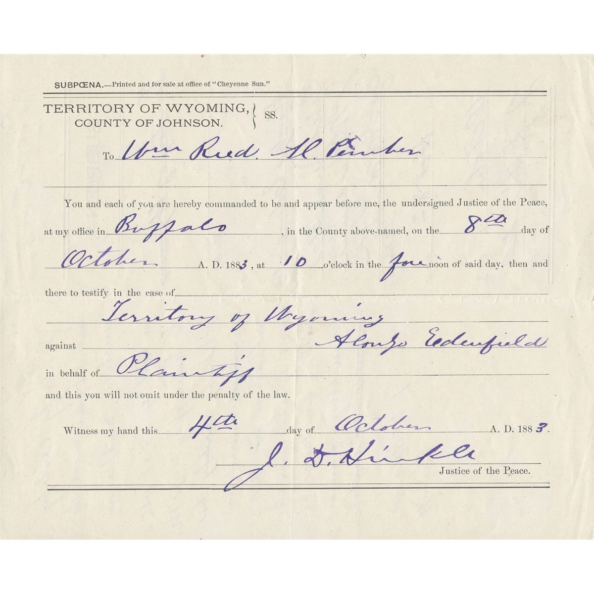 Frank Canton Signed Subpoena - Wyoming Territory. "Territory of Wyoming, County of Johnson" Subpoena, signed by "F M Canton" as Sheriff, and "J.D. Hinkle" as Justice of the Peace. The subpoena commands the witnesses to appear to testify in the case of "Territory of Wyoming against Alonzo Edenfield in behalf of Plaintiff". Signed October 4, 1883.