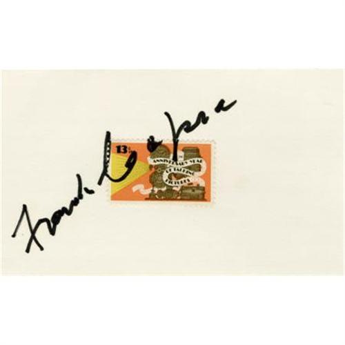 <B>Frank Capra Autograph.</B></I> A 5" x 3" card, with a 13-cent commemorative postage stamp affixed, signed by the multiple Oscar-winning director in black ink. Capra's autograph extends across the face of the stamp and is large and clean. In Excellent condition.<BR><BR><b>Shipping:</b> Flat Material, Small (<a target="_blank" href="http://www.heritageauctions.com/common/shipping.php">view shipping information</a>)