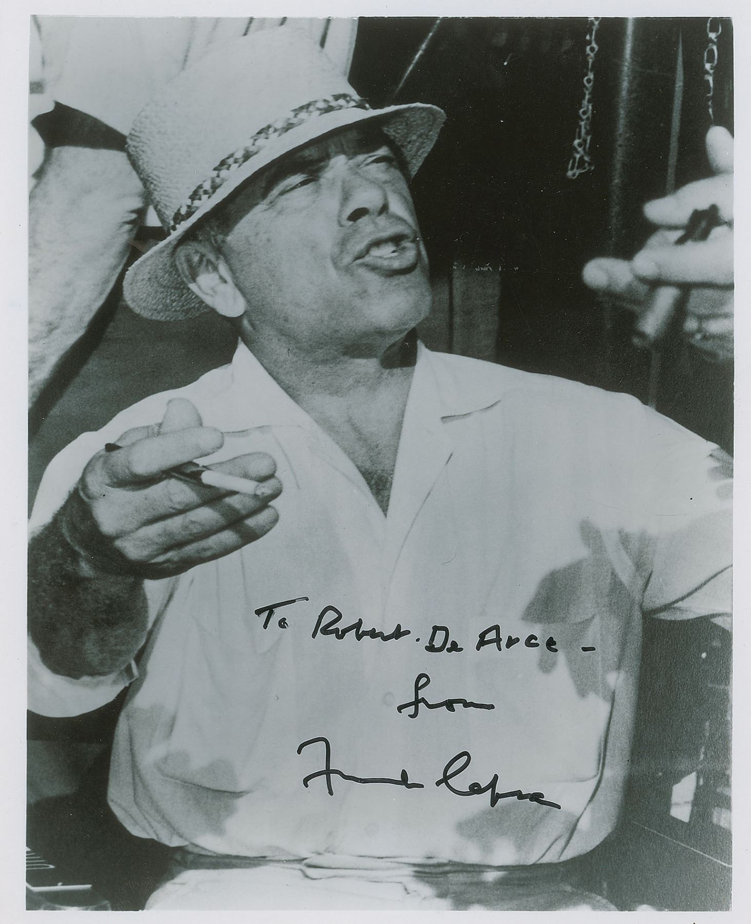 Glossy 8 x 10 photo of the great director, signed and inscribed in black felt tip, "To Robert DeArce, from Frank Capra.” In fine condition.