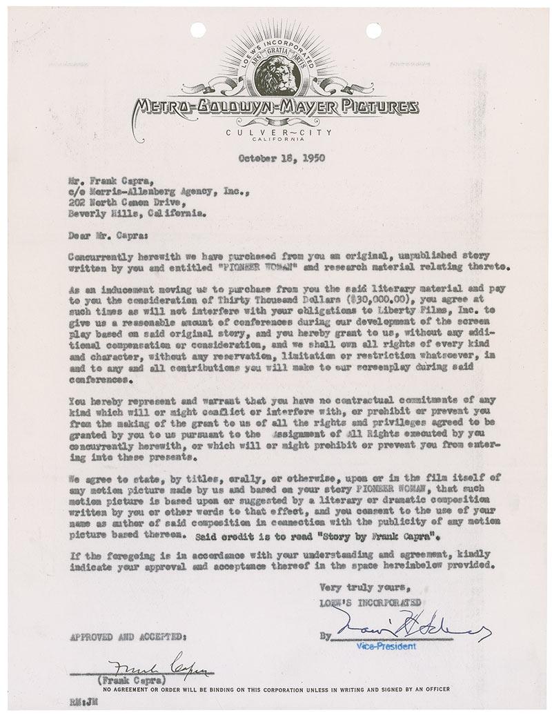 DS, one page, 8.5 x 11, October 18, 1950. Agreement between MGM Pictures and Capra, where the studio has purchased a story written by Capra entitled Pioneer Woman for the sum of $30,000. Capra agrees to provide conferences to the studio should it be developed by the studio, with Capra receiving a writing credit should a film be made. Signed at the bottom by Capra. In fine condition, with punch and staple holes to top, a few creases, and some scattered light soiling.