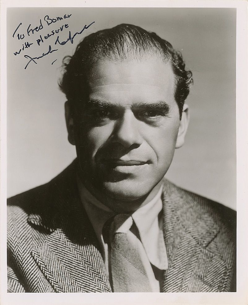 Glossy 8 x 10 head-and-shoulders photo of a suited Capra, signed and inscribed in black felt tip “To Fred Bomar, with pleasure, Frank Capra.” In fine condition, with light spotting to finish.