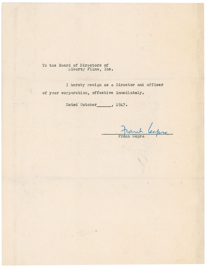 DS, one onionskin page, 8.5 x 11, October 1947. A brief letter of resignation to the board of Liberty Films. In full: “I hereby resign as a Director and officer of your corporation, effective immediately.” In fine condition, with a crease to the lower right corner and scattered light wrinkling.