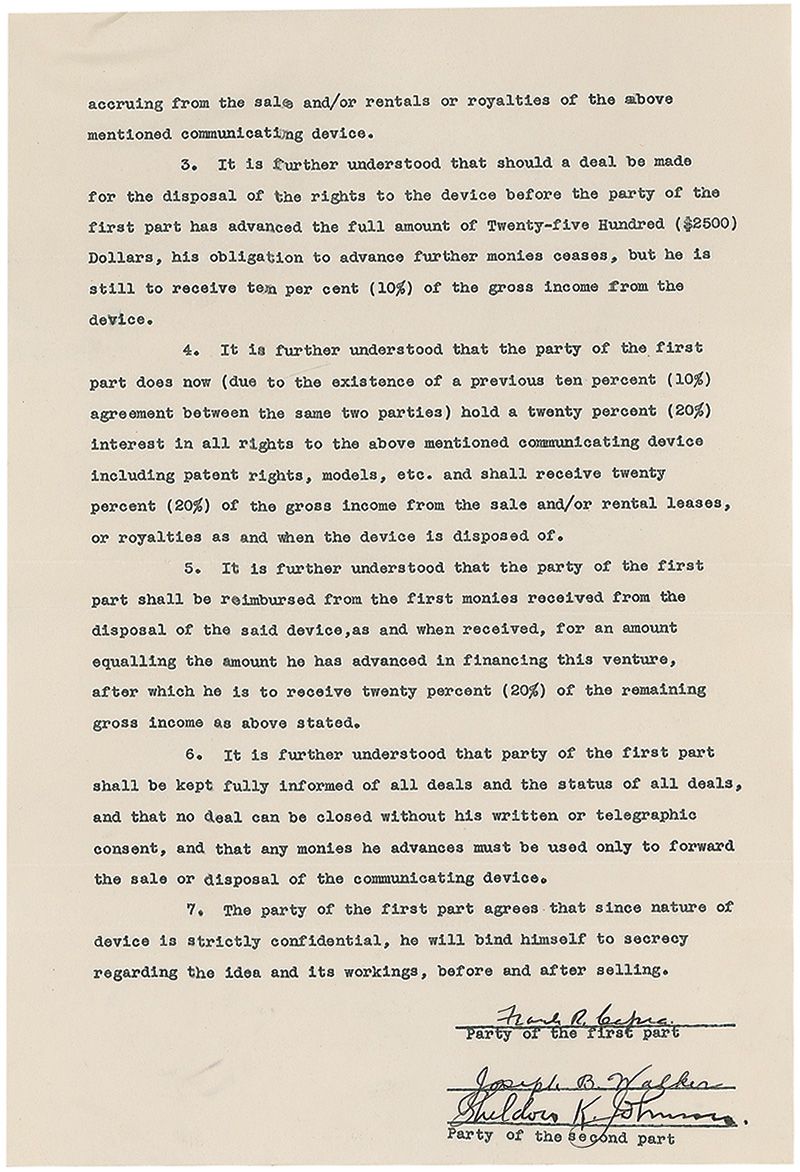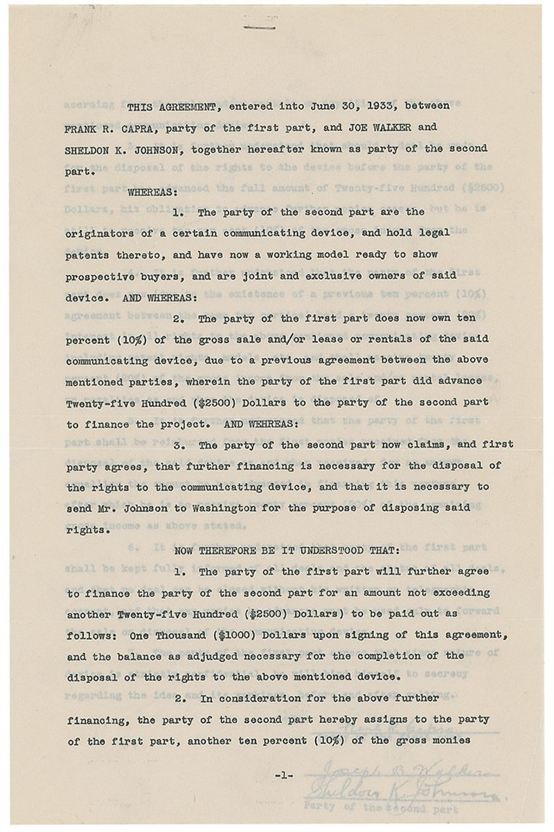 DS, signed “Frank R. Capra,” two pages, 8.5 x 13, June 30, 1933. Agreement between Capra and Joe Walker and Sheldon K. Johnson regarding Capra’s investment in their invention of “a certain communicating device.” In part: “The party…have now a working model ready to show prospective buyers…further financing is necessary for the disposal of the rights to the communicating device, and…it is necessary to send Mr. Johnson to Washington for the purpose of disposing said rights…It is further understood that [Capra]…shall receive twenty percent (20%) of the gross income from the sale and/or rental leases, or royalties as and when the device is disposed of.” In fine condition, with three horizontal folds, light scattered wrinkling, a paperclip mark and impression to the upper left, and a staple to the top edge.