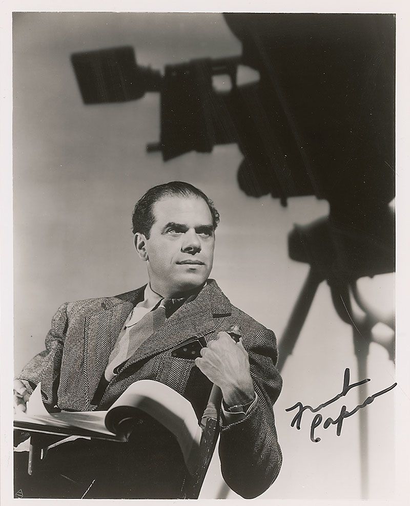 Glossy 8 x 10 photo of Capra in front of the massive shadow of a camera, signed in black felt tip. In very fine condition.