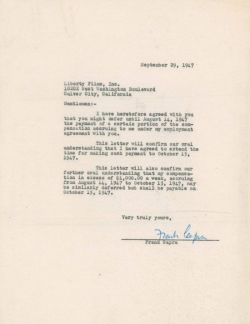 DS, one onionskin page, 8.5 x 11, September 29, 1947. Confirmation from Capra to Liberty Films regarding a deferred payment. In fine condition, with a few mild creases and paperclip impressions to the upper border.
