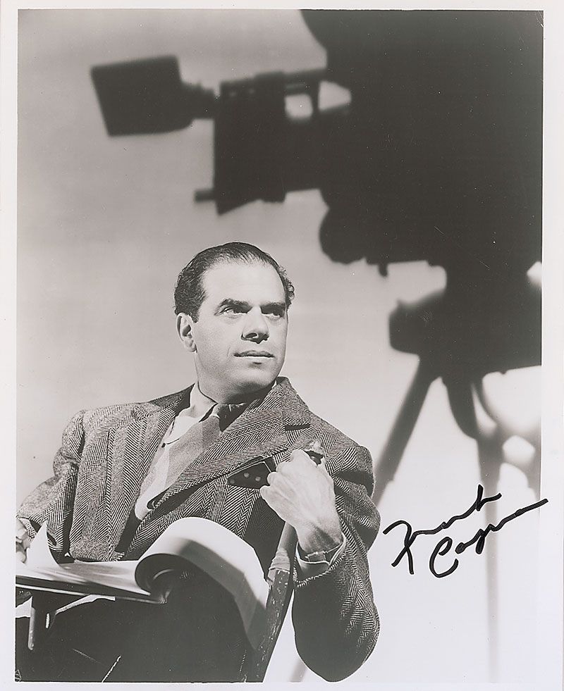 Glossy 8 x 10 photo of Capra with a script in his lap and a shadow of a camera in the background, signed in black felt tip. In fine condition.