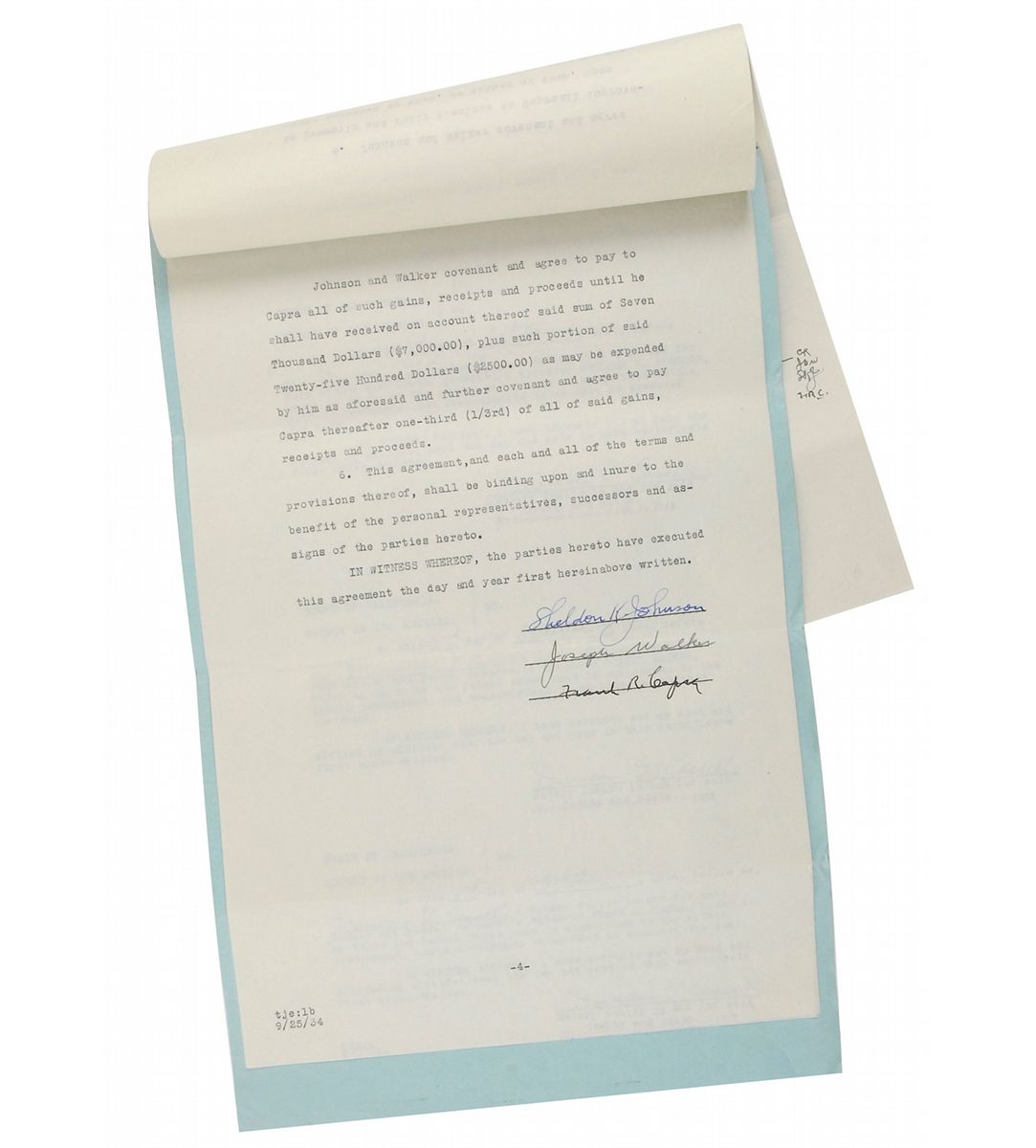 DS, signed “Frank R. Capra,” five pages, 8.5 x 13, September 26, 1934. Agreement between Sheldon K. Johnson, Joseph Walker, and Frank R. Capra regarding Capra’s investment in Walker’s patents. In part: “Whereas, Walker has heretofore applied for…designs covered by the following patent application numbers, to wit: 611449, 691406, 704040…Walker has heretofore assigned to Johnson one-half (1/2) of his right…Capra has heretofore advanced and expended the sum of…$7,000…Johnson and Walker…assign and transfer unto Capra the undivided one-third (1/3) part of the whole right, title and interest in and to said inventions.” Signed at the conclusion by all three parties, who also initial the first page. Document is stapled into its original paper folder. In fine condition. with expected document wear. Walker was a cinematographer who collaborated with Capra extensively throughout his career, including on classics like It Happened One Night, Mr. Deeds Goes to Town, Mr. Smith Goes to Washington, and It's a Wonderful Life. He also held numerous patents on camera and film related devices that ranged from zoom lenses to a ‘facial makeup meter.’ The patents described here were for a ‘Method and means of recording and reproducing secret messages,’ a ‘Carrier for code messages,’ and a ‘Method and means of recording and reproducing secret messages.’ This last invention is described in the patent as being ‘particularly useful for diplomatic messages, as it may be readily transmitted over a wire or by radio’ and that even cryptographic experts had been unable to intercept and decode the device’s messages during testing.