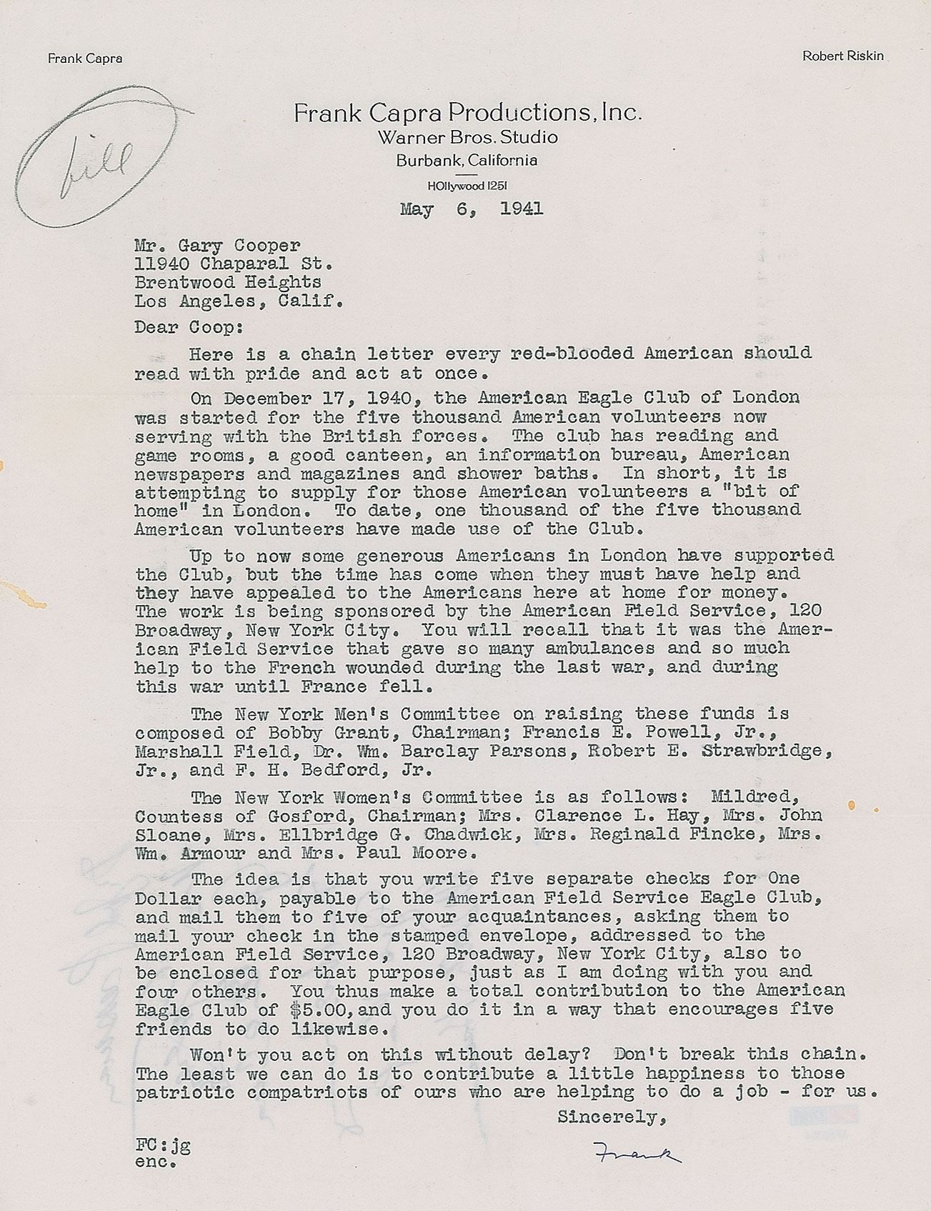 Terrific World War II-dated TLS signed “Frank,” one page, 8.5 x 11, Frank Capra Productions, Inc. letterhead, May 6, 1941. Letter to "Coop," legendary actor Gary Cooper, in part: "Here is a chain letter every red-blooded American should read with pride and act at once. On December 17, 1940, the American Eagle Club of London was started for the five thousand American volunteers now serving with the British forces. The club has reading and game rooms, a good canteen, an information bureau, American newspapers and magazines and shower baths. In short, it is attempting to supply for those American volunteers a 'bit of home' in London. To date, one thousand of the five thousand American volunteers have made use of the Club. Up to now some generous Americans in London have supported the Club, but the time has come when they must have help and they have appealed to the Americans here at home for money. The work is being sponsored by the American Field Service…You will recall that it was the American Field Service that gave so many ambulances and so much help to the French wounded during the last war, and during this war until France fell…The idea is that you write five separate check for One Dollar each, payable to the American Field Service Eagle Club, and mail them to five of your acquaintances, asking them to mail your check in the stamped envelope, addressed to the American Field Service…also to be enclosed for that purpose, just as I am doing with you and four others. You thus make a total contribution to the American Eagle Club of $5.00, and you do it in a way that encourages five friends to do likewise. Won't you act on this without delay? Don't break this chain. The least we can do is to contribute a little happiness to those patriotic compatriots of ours who are helping to do a job—for us." In fine condition. When Japan bombed Pearl Harbor on December 7, 1941, Capra left his career as a Hollywood director and received a commission as a major in the United States Army, eventually heading a special film team that would create the seven-part series 'Why We Fight.' Accompanied by a certificate of authenticity from PSA/DNA.