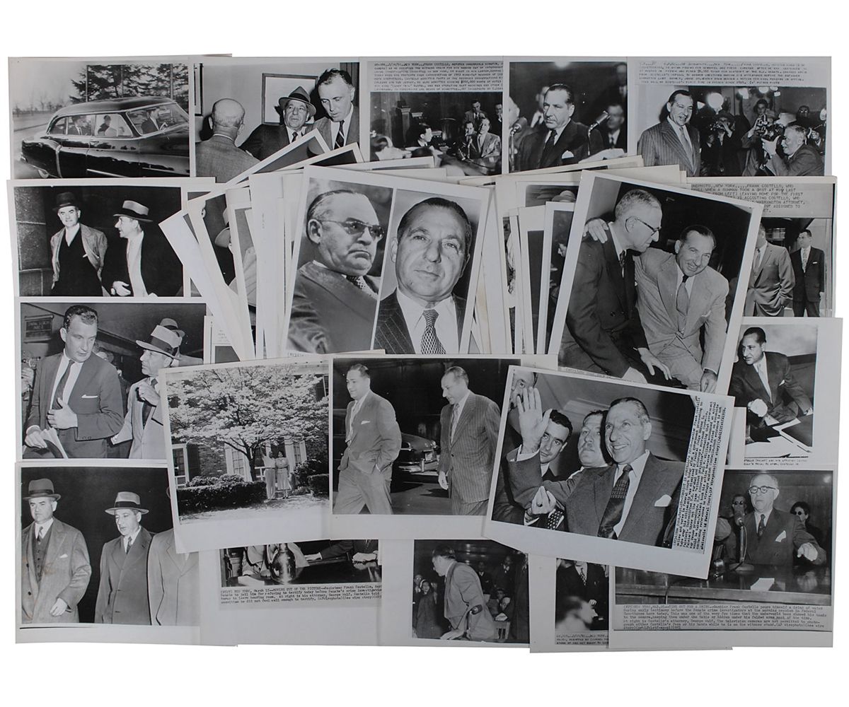 Collection of approximately 53 photos, consisting primarily of glossy press photos, most 7 x 9 or 8 x 10, dated between 1943 and 1961 (majority early 1950s), many bearing inherent captions to the borders. Most photos show Costello in court or conferring with lawyers, and others include him leaving prison, speaking to reporters, and giving money to a panhandler. In overall fine condition, with normal news use and wear.