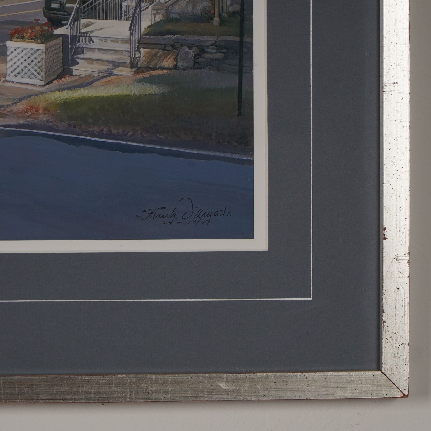 A detailed and atmospheric Monterey Massachusetts street scene print by American artist Frank D'Amato. Rendered in a realistic style, the artwork captures a quiet intersection in the small town, featuring the library, cars, a general store, flagpoles, and homes with early autumn foliage. The piece is professionally matted in a blue-gray surround and housed in a silver-toned metal frame with wire backing. D'Amato is known for his nostalgic and finely executed portrayals of American architecture and landscapes, often depicting serene small-town moments with remarkable clarity and light.
