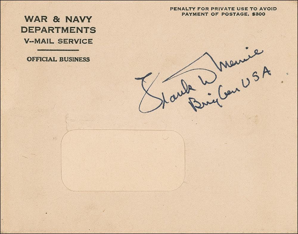 American general best remembered for his command of Merrill’s Marauders in the Burma Campaign of World War II. War and Navy Departments envelope, 4.75 x 3.75, signed in black ink across the front, “Frank D. Merrill, Brig. Gen. USA.” Scattered soiling and small tear near address window, otherwise fine condition. RRAuction COA.