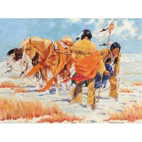 <B>FRANK D. MILLER (American, 20th Century)</B></I><BR><I>Indian Scouts</B></I><BR>Oil on canvas<BR>26 x 35 inches (66.0 x 88.9 cm)<BR>Signed lower right: <I>Frank D. Miller</B></I><BR> <B>Condition Report:</B> Canvas has been relined, otherwise good condition.<BR><BR><b>Shipping:</b> Requires 3rd Party Shipping (<a target="_blank" href="http://www.heritageauctions.com/common/shipping.php">view shipping information</a>)
