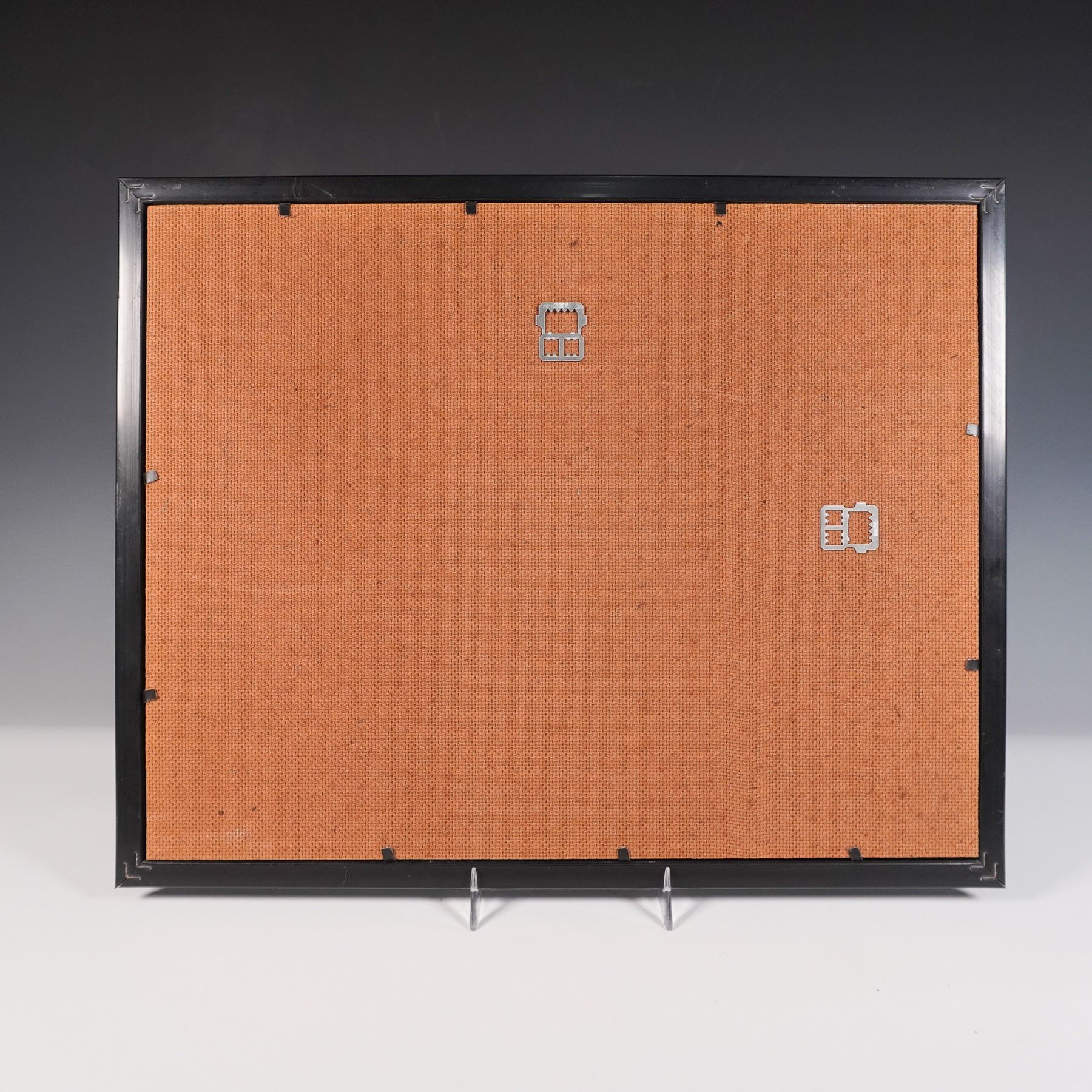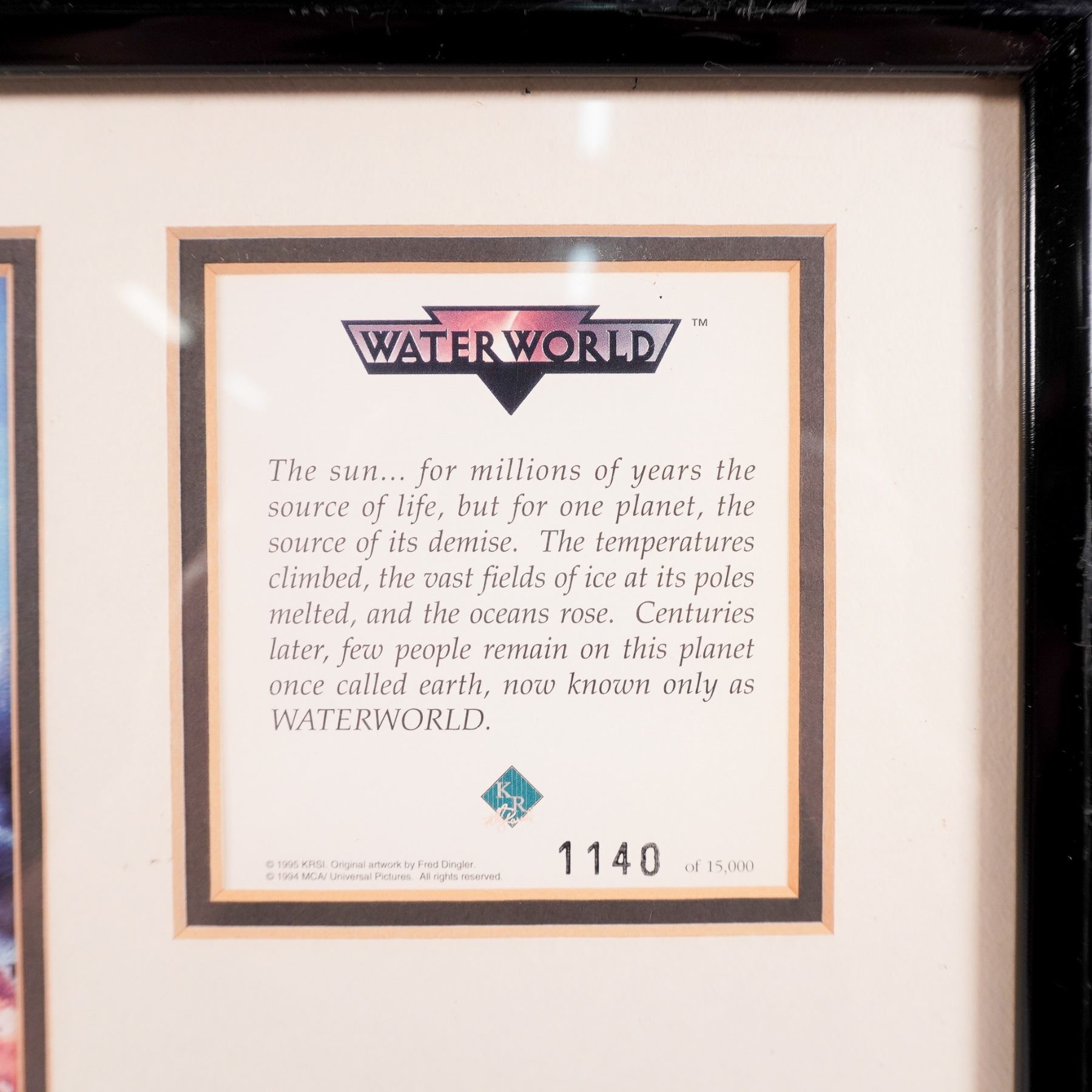 Framed limited edition lithograph featuring imagery from the 1995 American post-apocalyptic action film Waterworld, starring Kevin Costner and Dennis Hopper. The composition includes an illustrated portrait of Kevin Costner, a printed synopsis of the film, and a printed mini-poster. Original artwork by Fred Dingler. Copyrighted 1995 by MCA/Universal Pictures and KRSI. This lithograph is numbered 1140 out of an edition of 15,000. Encased in a black frame with a double mat. Frame size: 15"L x 0.75"W x 12.25"H. Sight size: 13"L x 10.25"H.