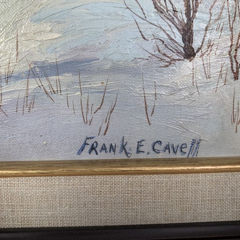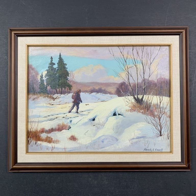 Frank E. Cavell's "Winter Stroll" original acrylic on canvas board painting, signed lower right. This piece is a winter scene, of a man with a backpack trecking through the snow. This piece is in excellent condition.