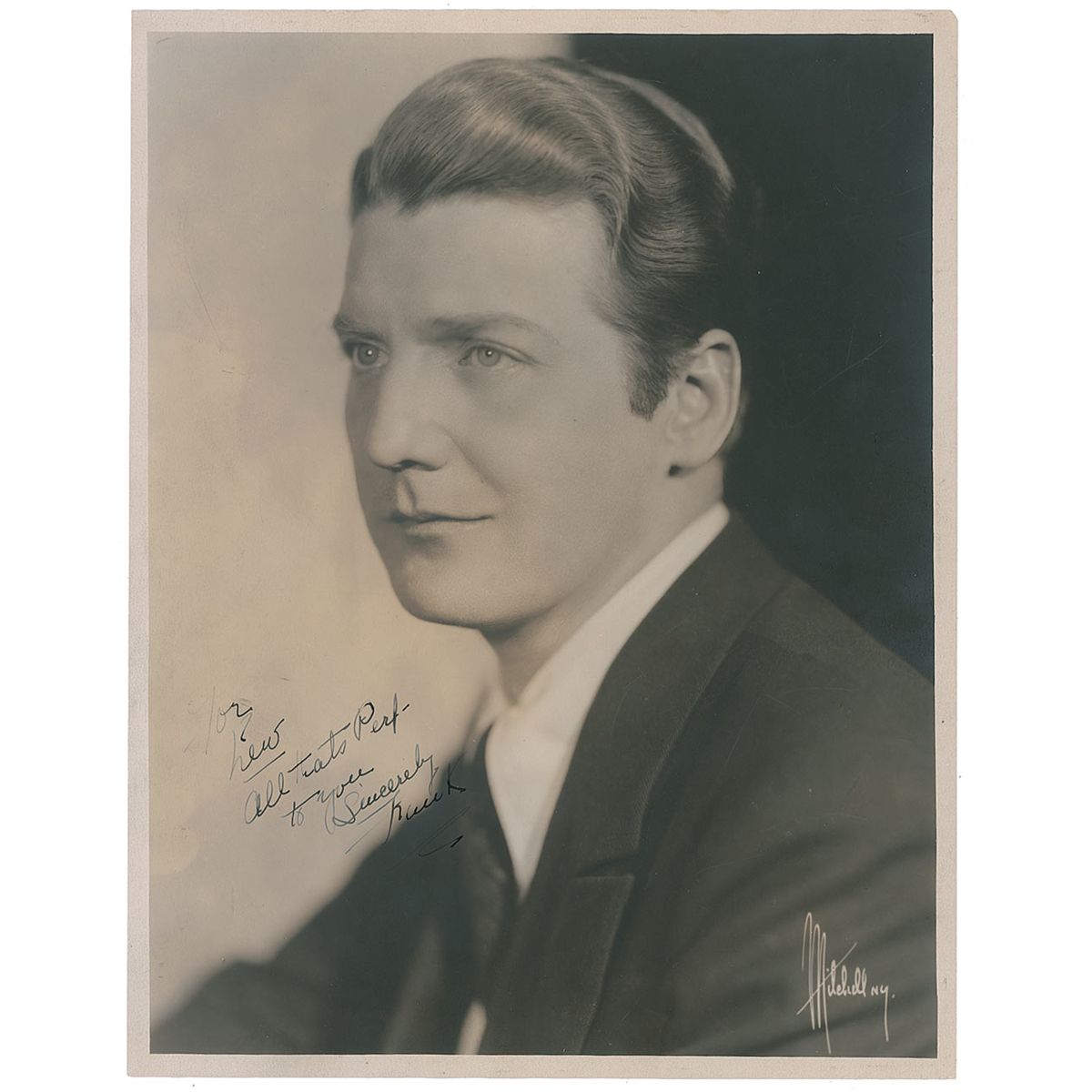Handsome vintage matte-finish 10.5 x 13.5 head-and-shoulders photo, signed and inscribed in fountain pen, “For Lew, All that’fs Perf—to you, Sincerely, Frank.” Scattered light surface creasing, marks,and areas of discoloration to the image and background, and slight contrast to the end of the signature, otherwise fine condition. Frank Fay was married to actress Barbara Stanwyck.