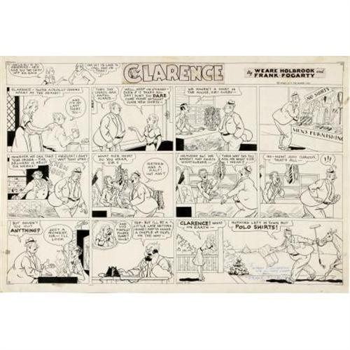 <B>Frank Fogarty - Clarence Sunday Comic Strip Original Art, dated 9-8-46 (New York Herald-Tribune Syndicate, 1946). </B></I> Nothing comes easy for lovable, roly-poly Clarence Gimper, not even buying a new shirt. Frank Fogarty inscribed and signed this piece for a fan in 1961. This strip has an image area of 24.75" x 16.5", and the art is in Very Good condition.<BR><BR><b>Shipping:</b> Flat Material, Large (<a target="_blank" href="http://www.heritageauctions.com/common/shipping.php">view shipping information</a>)