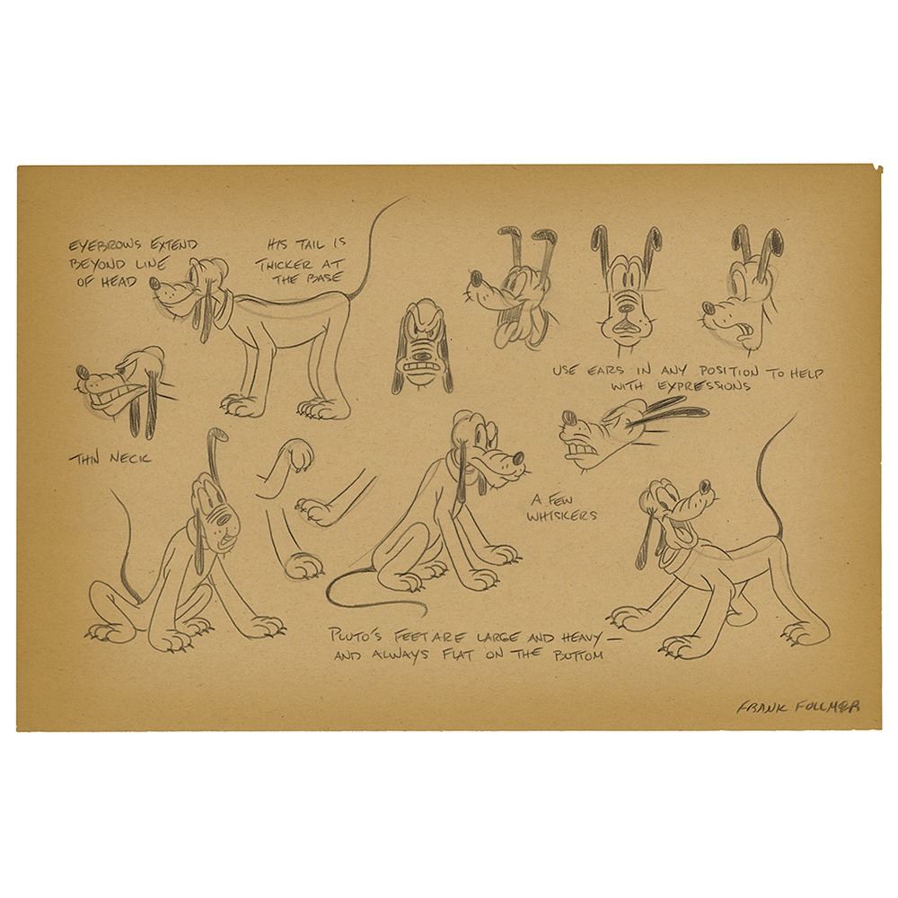 (Walt Disney Studios, 1937) Original preliminary model sheet drawing of Pluto by Frank Follmer, which shows 11 different images of the Mickey Mouse’s beloved pet dog. Accomplished in graphite on untrimmed 15.5 x 10 artist paper, which is signed in the lower right, "Frank Follmer,†who adds various notes to the images, such as “Eyebrows extend beyond line of head†and “His tail is thicker at the base.†In fine condition, with a few short tears to the right edge. Follmer worked at Walt Disney Studios from the late 1930s through the early 1940s, assisting on projects like Snow White and the Seven Dwarfs, Pinocchio, and Fantasia. He alienated Walt Disney when he organized a strike against the studio, and ultimately left to join the Navy.
