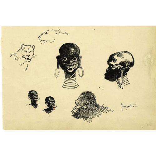 <B>Frank Frazetta - "African Sketches" Original Art (undated). </B></I> Any art collector would be pleased to own these pen and ink sketches of African women, lions, and a gorilla by Frank Frazetta. This piece measures 8" x 5.25", and is in Excellent condition. Signed by Frank Frazetta at the lower right. <BR><BR><b>Shipping:</b> Flat Material, Small (<a target="_blank" href="http://www.heritageauctions.com/common/shipping.php">view shipping information</a>)