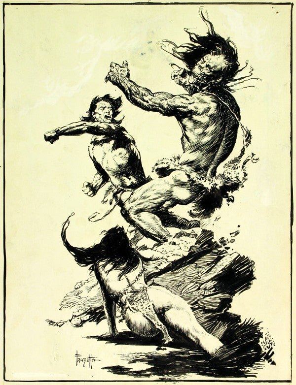 Lithograph on paper, Caveman Fighting for his Woman, 1965, by Frank Frazetta (American, 1928-2010), Signed by Frank Frazetta "Frazetta" lower left, image: 14.5"h x 11"w.