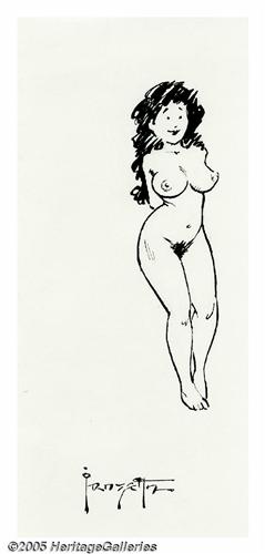 <B>Frank Frazetta - Cheerful Nude Girl Sketch Original Art (undated).</B></I> A darling little sketch of a smiling nude girl by Frank Frazetta. She's obviously uninhibited, but still a little bit shy -- and just adorable! Won't you give her a good home? This drawing measures 2.5" x 6" and is in Excellent condition.