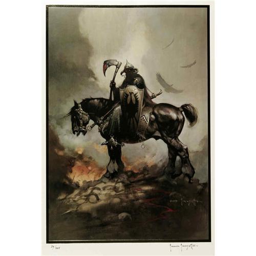 <B>Frank Frazetta - "Death Dealer" Limited Edition Print, Gold Edition #54/345 (circa 1980).</B></I> The "Death Dealer" is one of Frank Frazetta's most famous images. It has been used on rock album covers, graced the cover of <B>American Artist</B></I>, and inspired a comic book series. This super-high quality print is part of a Gold Edition (limited to the first 100 prints of the entire edition). The image was printed using twelve-color, continuous-tone inks on archival-quality, acid-free, cotton rag, with a special opalesque finish. This print from the Gold Edition and is silk-textured, with a small inlaid gold trim around the image area. The work was signed by Frank Frazetta, and is numbered 54/345. The print has an image area of 16" x 24", and the print is in Excellent condition.