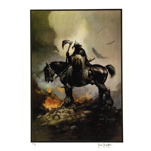 <B>Frank Frazetta - "Death Dealer" Limited Edition Print, Printer's Proof (Gold Edition) #P3/6, P4/6, and P5/6, Group of 3 (circa 1980).</B></I> The "Death Dealer" is one of Frank Frazetta's most famous images. It has been used on rock album covers, graced the cover of <B>American Artist</B></I>, and inspired a comic book series. The regular run of "Death Dealer" print had a "Gold Edition" that was limited to the first 100 prints of the entire 345 print edition. However, to make <I>these</B></I> three, super-high quality prints even more exclusive, please note that they are printer's proofs #3, 4, and 5 out of an edition of only six such printer's proofs! The image was printed using twelve-color, continuous-tone inks on archival-quality, acid-free, cotton rag, with a special opalesque finish. These prints are silk-textured, with a small inlaid gold trim around their image areas. Each print was signed by Frank Frazetta, and they are numbered p3/6, p4/6, and p5/6. Each print has an approximate image area of 16" x 24", and each print is in Excellent condition. <I>From the Estate of Bruce Hamilton.</B></I> <BR><BR><B>Important notice:</B> Heritage usually auctions material at the rate of 200-250 lots per hour. On some occasions eBay Live bid software or the Internet may not be able to keep up with the pace of the auction. We recommend placing a realistic absentee bid now as insurance to avoid disappointment. Occasionally the auctioneer may eliminate or reject an eBay Live bid, and the auctioneer may also reopen a lot after the close of the eBay live bidding (usually because we missed an audience bid), and may reject your bid even if it shows you as the winning bidder. By bidding via eBay Live, you agree that Heritage may award the lot to another bidder at its sole discretion under the circumstances described above or any other reasonable circumstances. Since eBay bids are not shown to us until we open the lot on the floor, we treat those bids just like floor bids. In most cases the floor responds before the eBay bid is presented to us, due to Internet lag time, so for consistency we have made it a policy that floor bids are always considered first over tie eBay live bids. Also please note that all Heritage lots purchased through eBay Live carry a 22.5% Buyer's Premium. Please make sure you read the Terms and Conditions before you bid. This lot is being auctioned in conjunction with a live floor auction by Heritage Auction Galleries. All final auction and invoice information will be supplied by Heritage Auction Galleries, and all other information should be considered preliminary. Lot:41001 <BR><BR><B>Winning Notification and Billing:</B> After the FINAL session in this auction is complete, Heritage will send e-mail and snail mail invoices. This process normally takes several days. All final auction and invoice information will be supplied by Heritage Auction Galleries, and all other information should be considered preliminary. <BR><BR>This auction will be conducted on a live auction floor and over the Internet through eBay Live. If you choose to place an absentee bid, please take a moment to <font color='#0000ff'><u><a href='http://pages.ebay.com/liveauctions/help/before/laabsentee.html'>learn how eBay Live absentee bidding works</a></u></font><font color='#000000'>