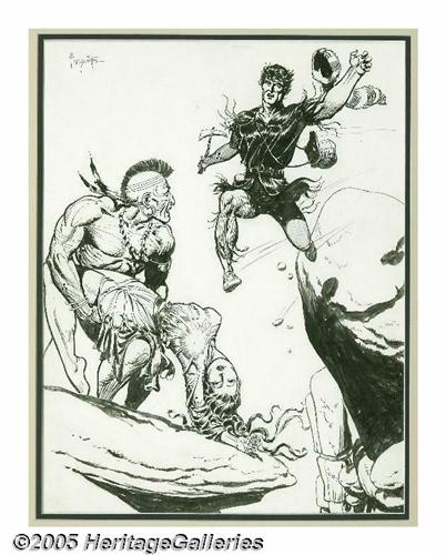 <B>Frank Frazetta - Indian Fighter Illustration Original Art (undated).</B></I> Frank Frazetta's savage battle scene recalls the explosive climax to James Fenimore Cooper's novel, <B>Last of the Mohicans</B></I>, where Hawkeye confronts Magua on the cliffs near Lake George. Frank Frazetta was an art prodigy and this early work shows his burgeoning talent. He entered art school at the age of eight and studied under Michael Falanga for five years. He continued to study art until the age of sixteen and then embarked on a career in comic books, comic strips -- and much later, paperback cover illustration. This fabulous illustration has an image area of 13" x 17" and the art is in Excellent condition.