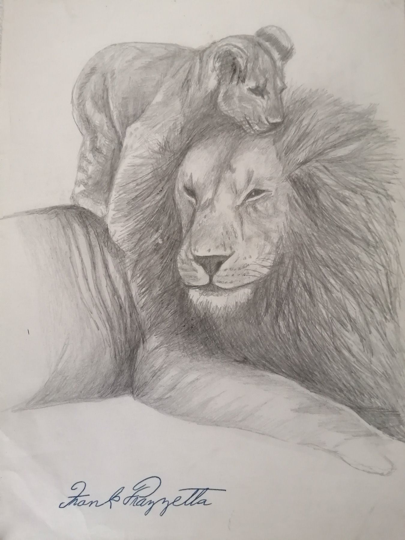 A pencil drawing by Frank Frazetta of a lion and its cub, signed.