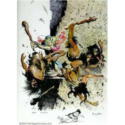 Frank Frazetta - Signed/Remarqued Print 35/50 (1973). This is a fantastic offering on several levels. First, the subject has mass appeal and notoriety. Secondly, Frank Frazetta is considered by many to be the greatest artist who ever worked in comic books. And best of all, this piece represents what is perhaps the quintessential Frank Frazetta cover, from Weird Science-Fantasy #29. This art work was intended as a cover for Famous Funnies, but was rejected for its overt violence. Highly desirable as a print as well, it is extremely well executed; bright, bold and evocative. The condition is superb. A very small edition, the intention was to publish 50 pieces, but Frazetta only ever finished 40, making the edition even a bit more exclusive; this print is number 35. The artist's hand is in evidence throughout the piece in the beautiful and intricate hand-coloring. It is hand-signed, dated and numbered by Frazetta, with a killer 2" x 4" sketch of a pre-historic man remarqued in the lower right corner. The print's main image area is approximately 13" x 17", and the piece has been professionally matted and framed.  Important notice: We expect to be auctioning lots at the rate of 200-250 per hour. Sometimes eBay Premier live bid software cannot keep up with that pace, so we strongly recommend that you place a realistic proxy bid now as insurance to avoid disappointment. Also please note that all Heritage/CAA lots purchased through eBay Premier carry a 20% Buyer's Premium.