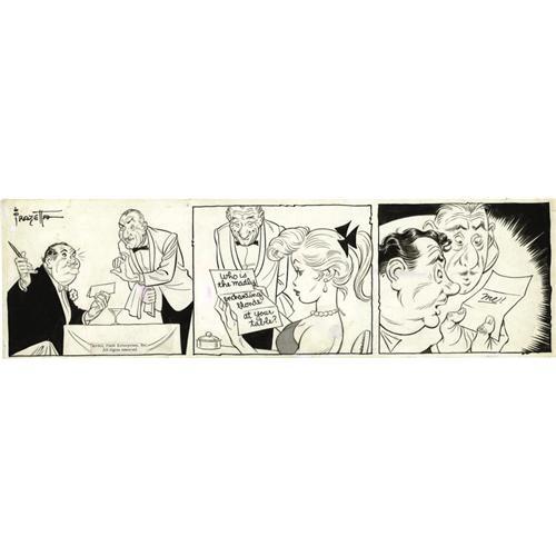 <B>Frank Frazetta - Sweet Adeline Daily Comic Strip Original Art (Field Enterprises, 1962).</B></I> Frank Frazetta only drew one week of dailies for his try-out newspaper strip, Sweet Adeline. When it comes to drawing sensuous "good girl" scenes, Frank Frazetta has few, if any, serious artistic rivals! Able to work in a lighthearted manner as well as in his more celebrated, ultra-dynamic fantasy style, this daily is a whimsical delight! The daily was signed at the upper left. The strip has an image area of 16.5" x 4.5", and aside from a few small red spots in panels one and two, the art is in Very Good condition. <BR><BR><b>Shipping:</b> Flat Material, Small (<a target="_blank" href="http://www.heritageauctions.com/common/shipping.php">view shipping information</a>)