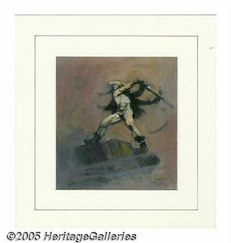 <B>Frank Frazetta - Warrior Color Preliminary Original Art (undated).</B></I> A sword-slinging warrior prepares to strike in this spectacular color preliminary painting by master fantasy painter Frank Frazetta. The image area measures 6" x 6.5", and the piece is roughly twice the size of many of Frazetta's other color prelims. The figure unleashes his coiled fury, and the atmospheric background lends the scene an air of menace-laden mystery; it's nothing short of a gem-like masterwork by Frazetta. The artwork has been tastefully matted, and is in Excellent condition.