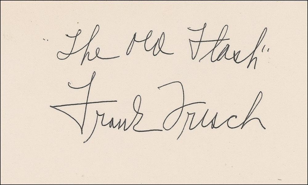 Black ballpoint signature, “’The Old Flash’ Frank Frisch,” on a white 5 x 3 card. In fine condition. Accompanied by the March 13, 1973, issue of “The Ram,” Fordham University’s newspaper (Frisch was an alumnus of the school), published following his death. Pre-certified Steve Grad/PSA/DNA and RRAuction COA.